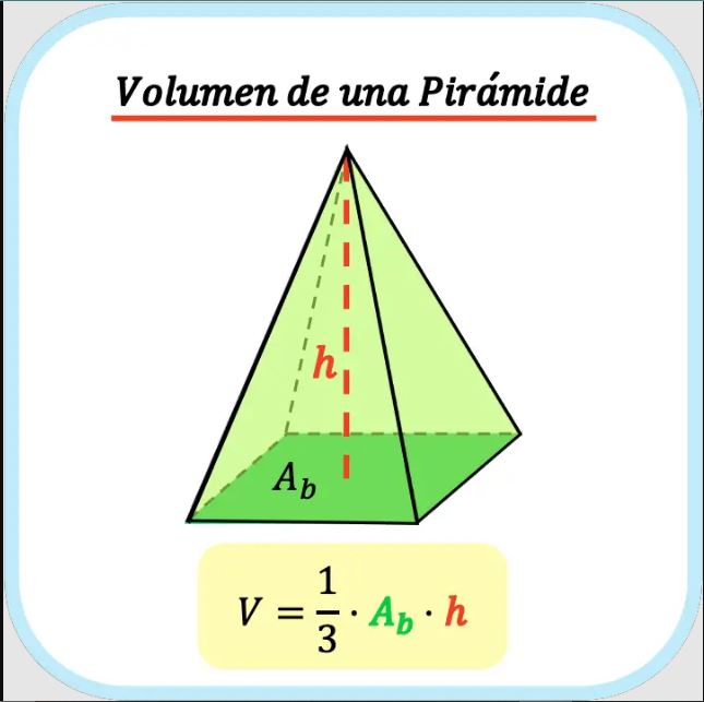 Para obtener el volumen de una pirámide es muy similar al del prisma, primero, se obtiene el área de la base y luego se multiplica por la altura. Sin embargo, ¿a qué nos recuerda una pirámide? Exacto, a un triángulo, por lo cual se divide entre tres, al ser una figura tridimensional.